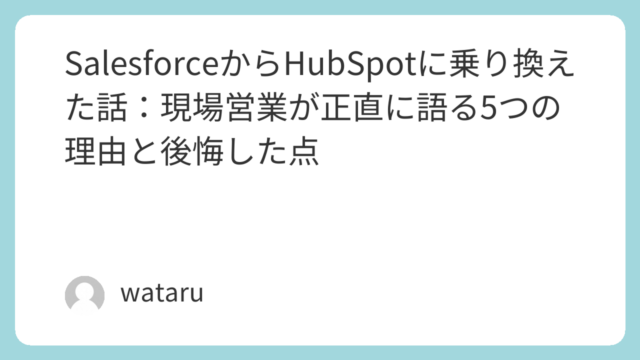 未分類 SalesforceからHubSpotに乗り換えた話:現場営業が正直に語る5つの理由と後悔した点 ※本記事にはアフィリエイトリンクを含みます。この記事を読んでいるあなたは、おそらくSalesforceに何かしらの不満を持っているはずです。コストが高い、使いこなせていない、現場の営業担当者が入力してくれない——そんな悩みを抱えながら、Hu... 2026.04.04 未分類